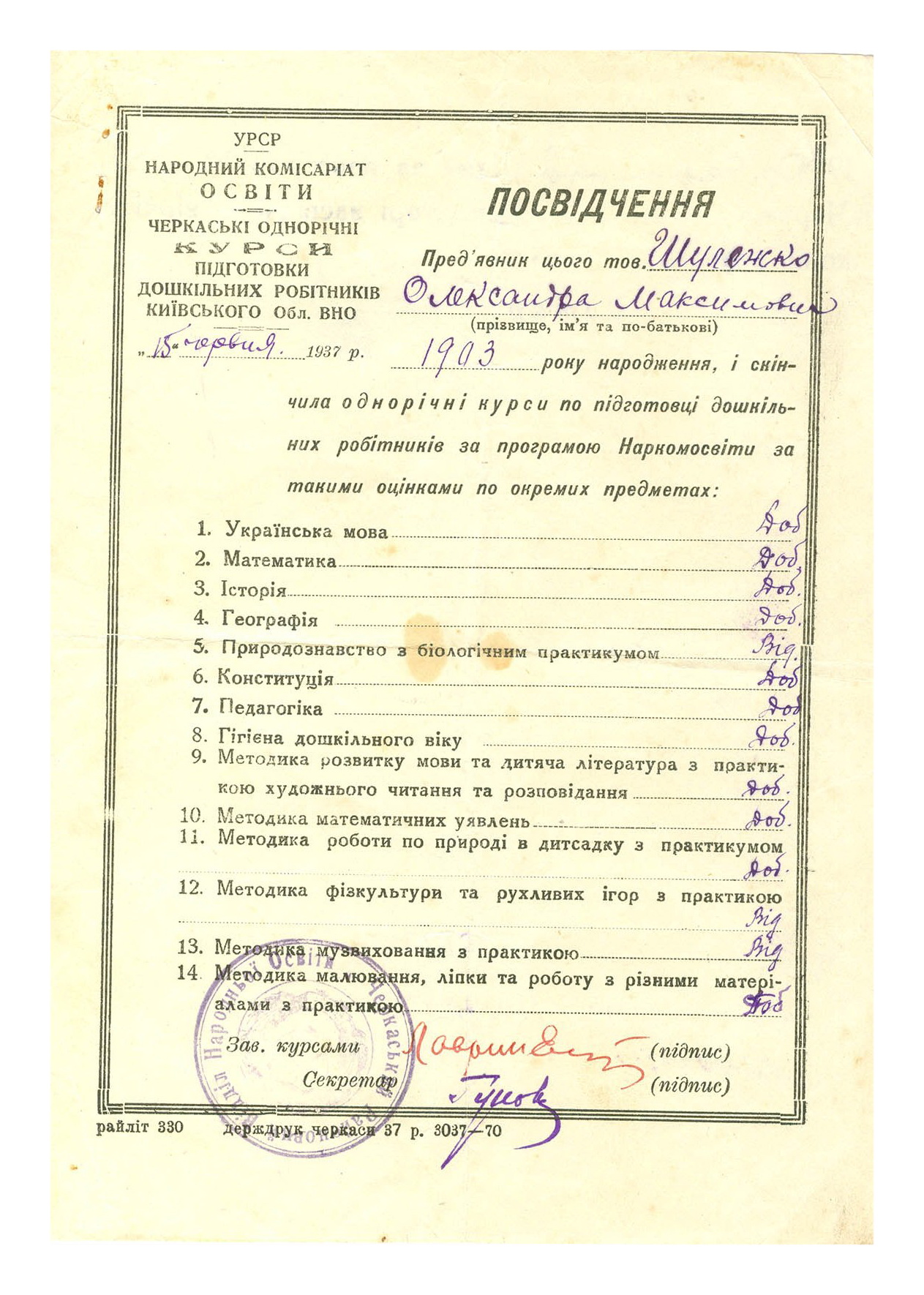 Certificate of completion of the Cherkasy one-year training courses for preschool workers of the Kyiv regional department of public education for Olexandra Shulezhko. Cherkasy. 15.06.1937