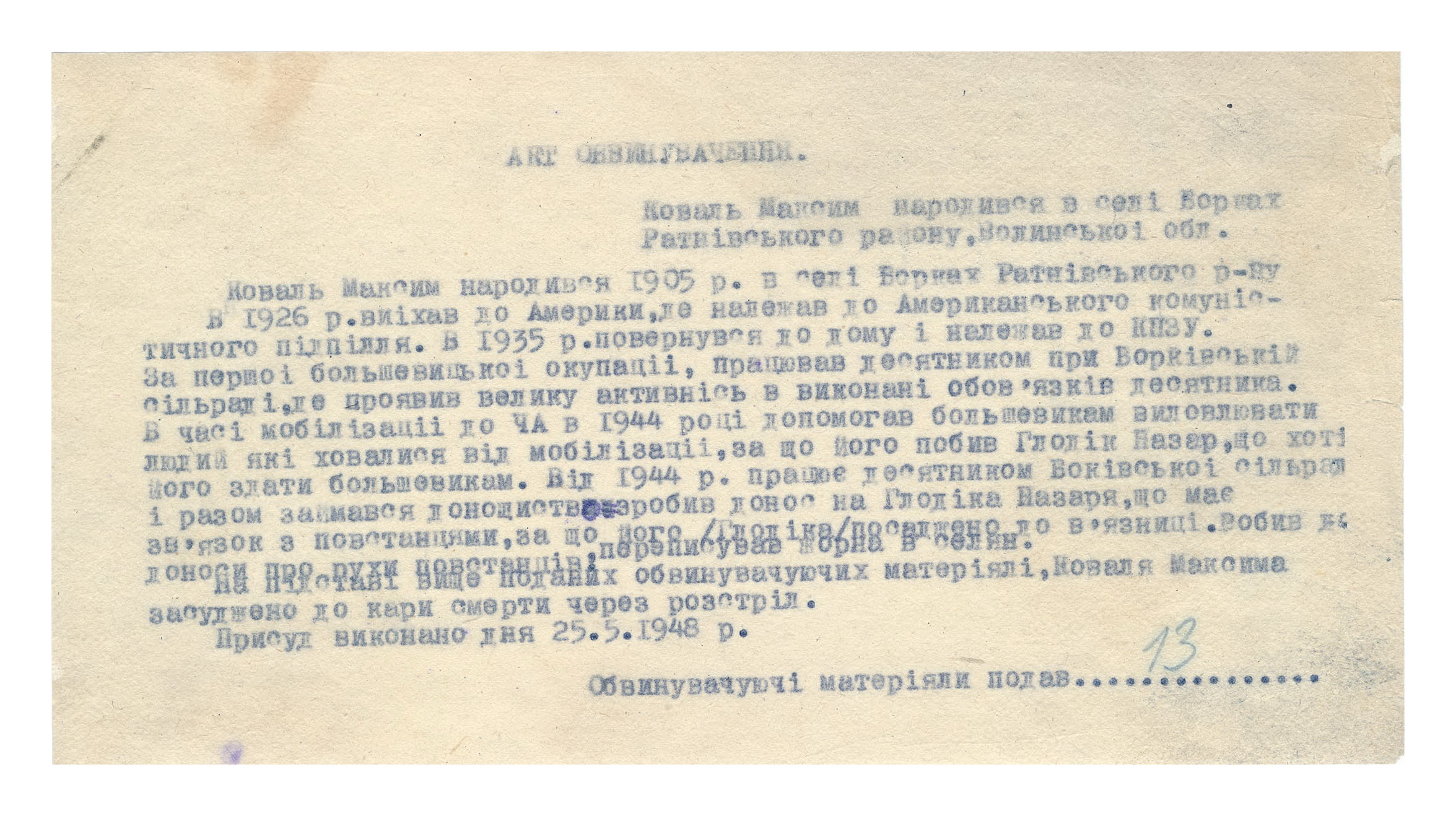 | Анотація | Характеризується донощиком. Засуджений до смертної кари 25.05.1948 |