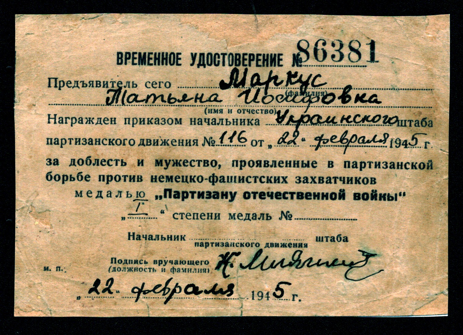 | Назва | Тимчасове посвідчення № 86381 до медалі «Партизану Вітчизняної війни» І ст. Тетяни Маркус Tetiana Markus’ temporary certificate No. 86381 for the medal “To a Partisan of the Patriotic War” of the 1st class |